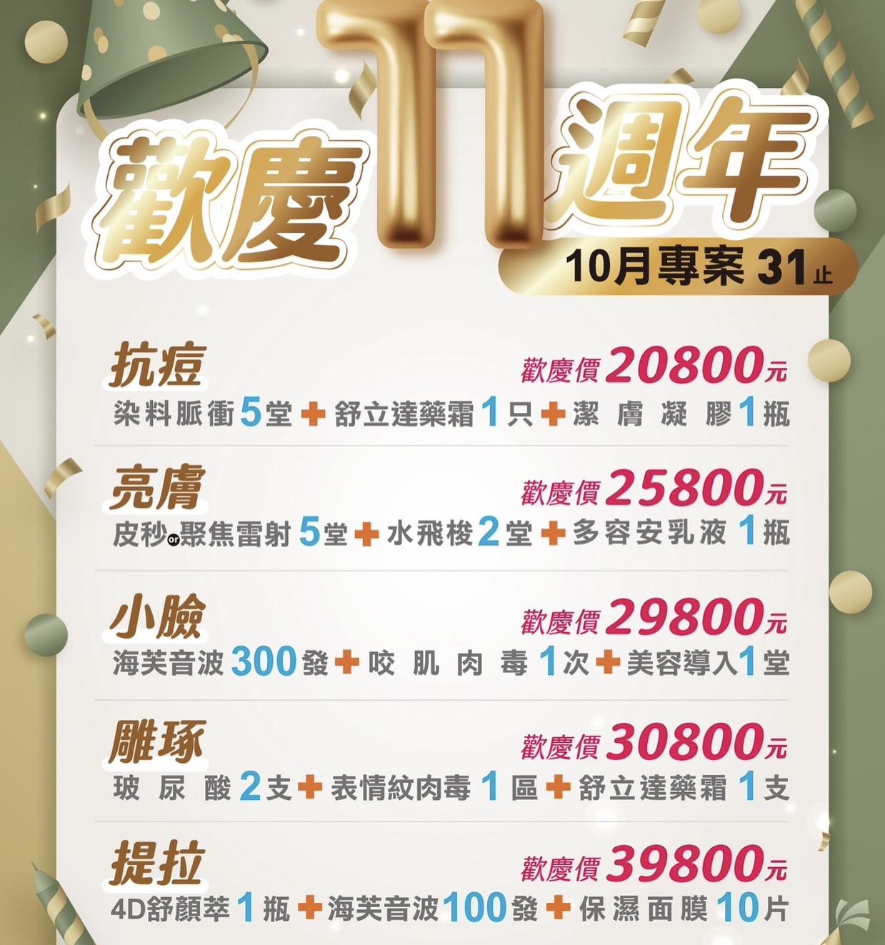 歡慶11週年,十月專案:脈衝光、皮秒雷射、音波、玻尿酸、舒顏萃、肉毒、水飛梭等皆享專案價,歡迎洽詢,ID搜尋@docj。請點入看海報~