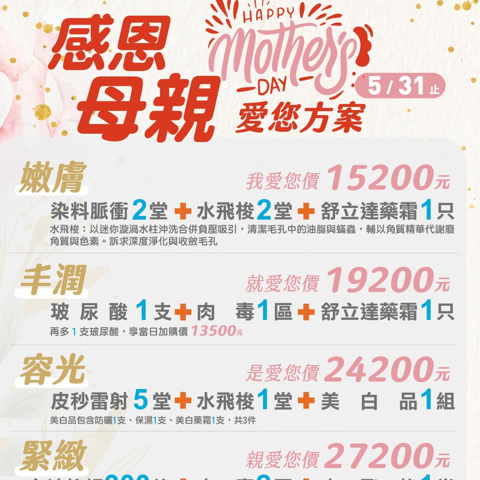 感恩母親,愛您方案。5/31止。新品推出水飛梭、4D童妍針。請點入見詳~