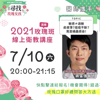 蔣富強醫師將在7/10(六) 20:00-21:15,線上分享『玫瑰斑(酒糟)衛教講座』,點入有報名網址,還有口罩贈品喔。