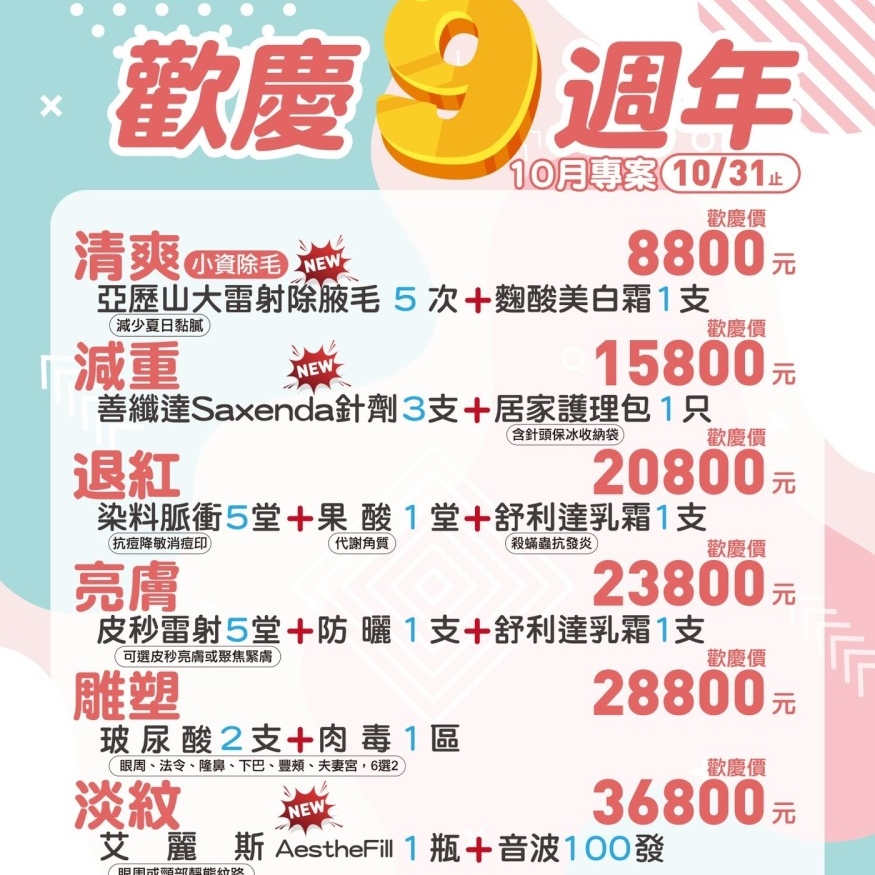 歡慶九週年,十月專案含除毛、減重、雷射、玻尿酸、艾麗斯等皆享歡慶價,10/31止。點入見海報~