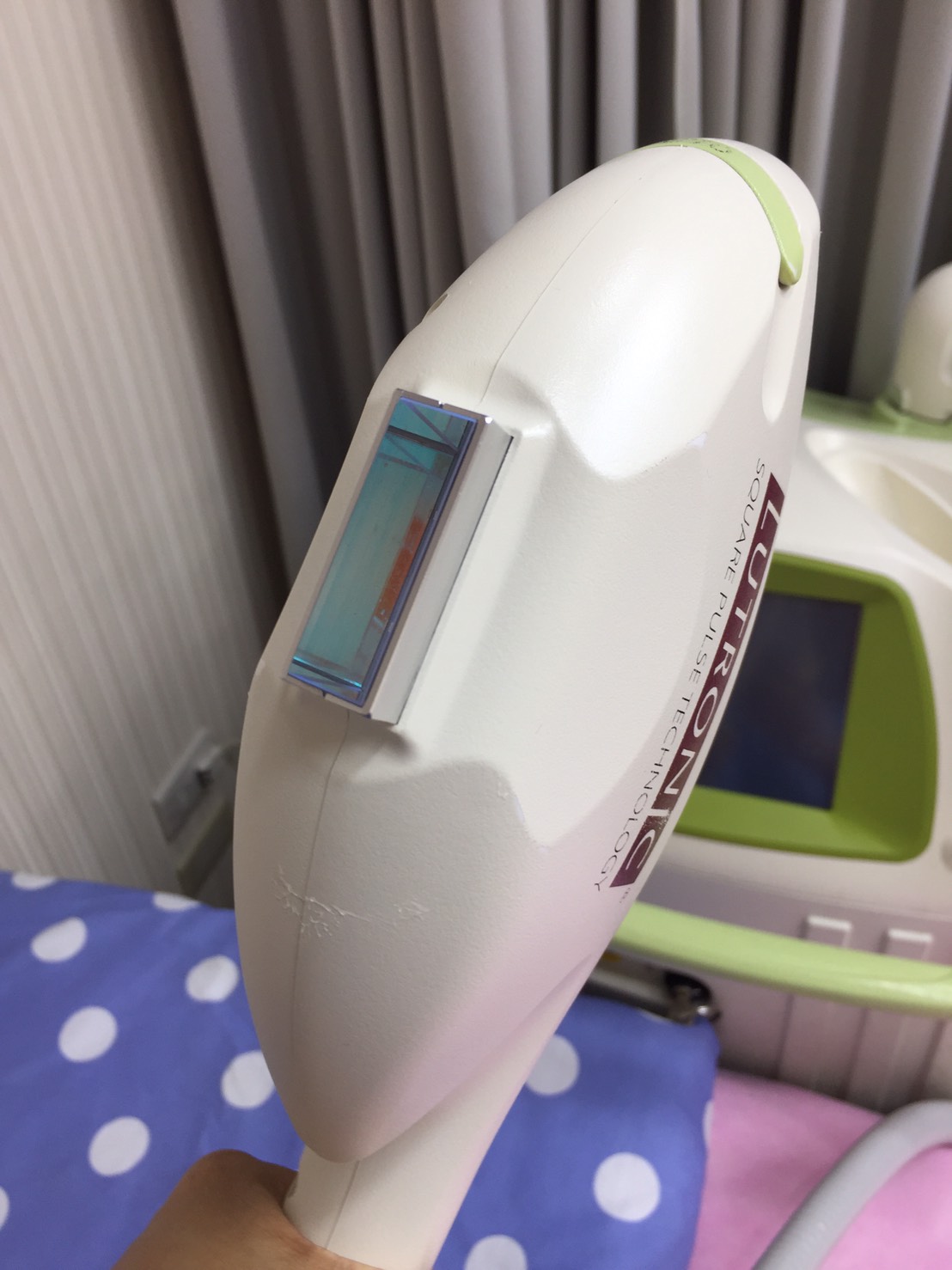 然後將光療探頭平貼於皮膚,手法像是在蓋印章,放妥後按鈕擊發能量。能量進入皮膚有點微熱,但不至於疼痛;另外會有亮光,像是閃光燈對我拍照的感覺。