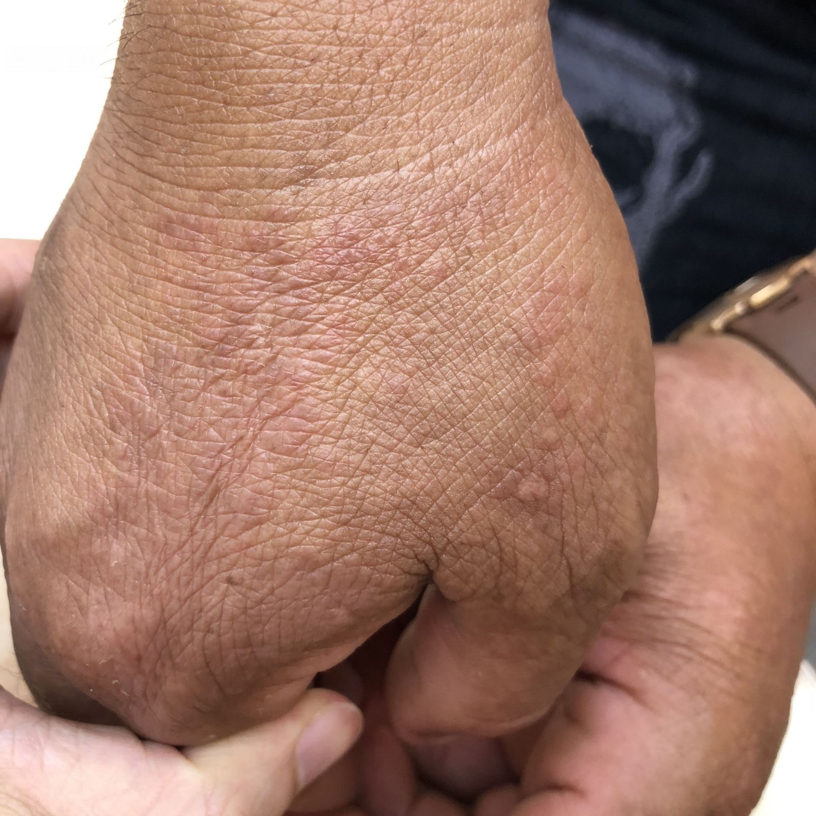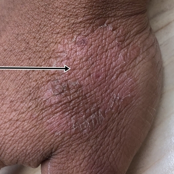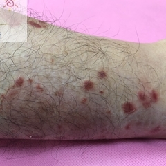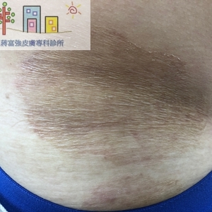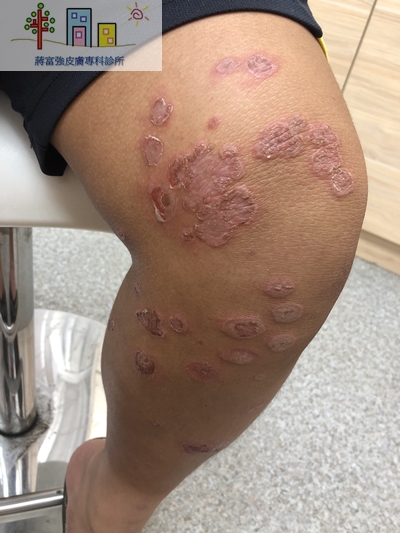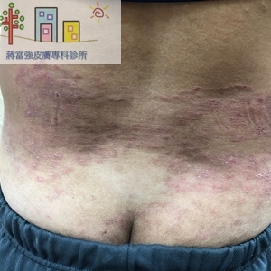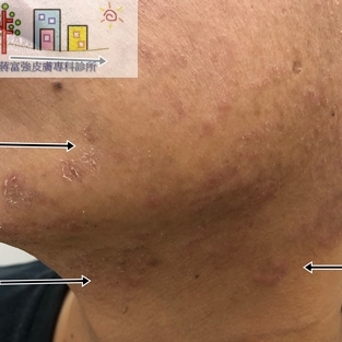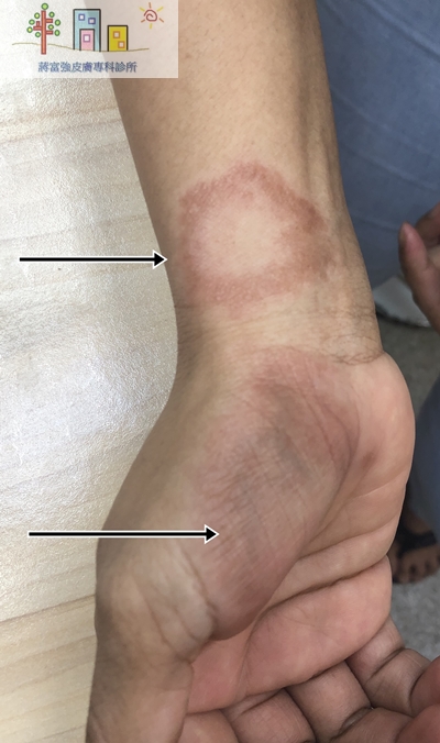 細看病灶,仍有保地圖形脫屑紅疹的樣貌。