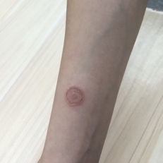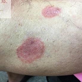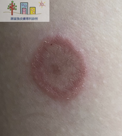 體癬,可以長在臉部、軀幹、四肢。一樣可見圓形、環形、或地圖型的病灶,其邊界清楚且發紅(active border,因為邊界的菌量較多、發炎也較厲害),發紅處帶有脫屑(因為黴菌會分解角質層做養分,所以會脫皮)。