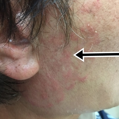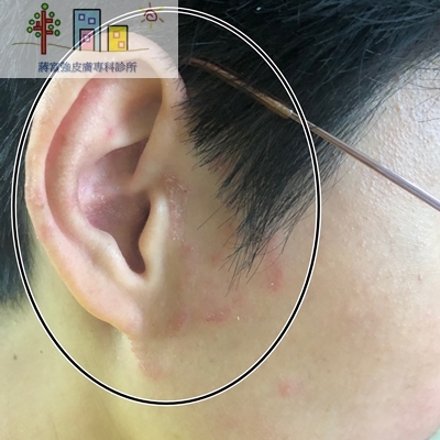 下圖病灶雖成地圖型,但細看發紅處不侷限於邊界,且脱屑亦不明顯,另外可見皮膚紋理變多、皮膚變薄(像衛生紙的質感)。經詢問,患部長期擦了某些不知名的藥(推測為類固醇)。本例診斷為類固醇引發的皮膚萎縮,而非黴菌感染,患部保濕六個月可回復正常。