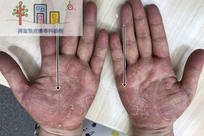 下圖病灶雖為地圖型、發紅侷限於邊界、脫屑明顯,但就部位上,手腳掌面的黴菌感染,多引發角質增厚脫屑而非發紅。本例診斷為毛孔性紅糠疹(pityriasis rubra pilaris)。