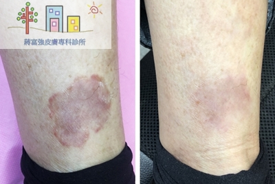 下圖病灶雖為地圖型且發紅侷限於邊界,但細看脫屑不明顯,觸摸起來有厚度。本例診斷為漢生病。