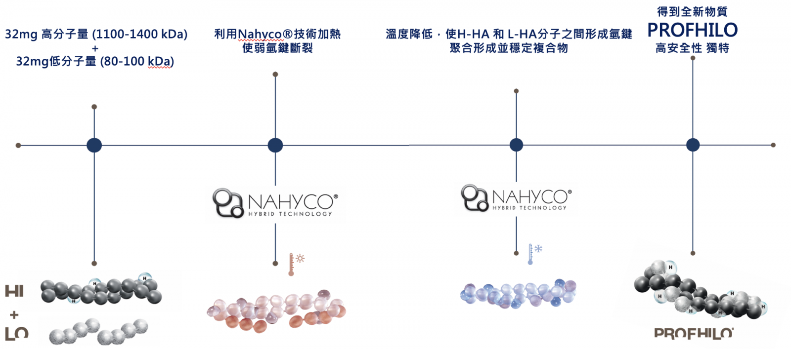 Profhilo®逆時針採用 NAHYCO® 專利技術,將高、低分子量之玻尿酸融合,形成全新結構: