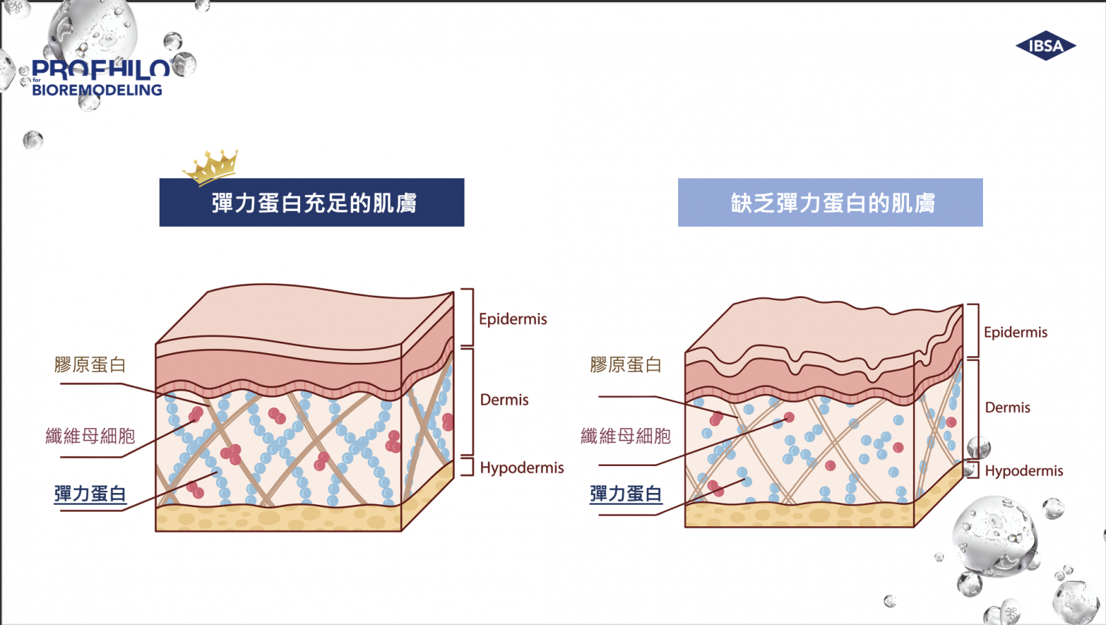 - 活化纖維母細胞:啟動彈力蛋白、膠原蛋白及糖胺聚醣的生成,重塑肌膚,恢復彈性與緊緻度。彈力蛋白決定真皮的彈性、膠原蛋白決定真皮的結構,兩者同樣重要;然而彈力蛋白在成年後幾乎不再自然生成,因此其再生尤為珍貴。