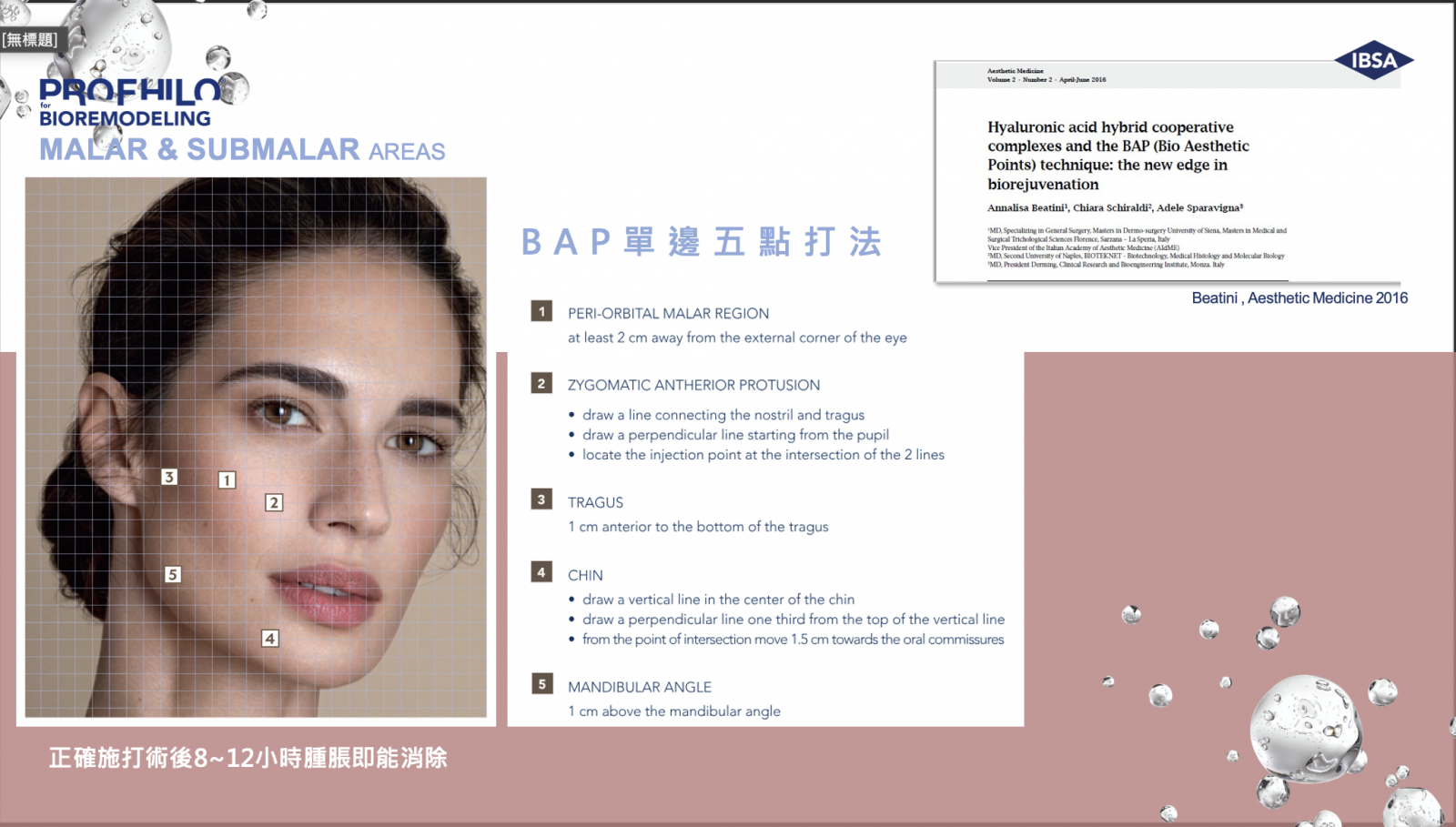 - 高流動性:產品能自然擴散,不需像水光針有密集針孔;每側僅5個針點即可覆蓋重點鬆老區域,如顴骨周圍、口周及下頜線。