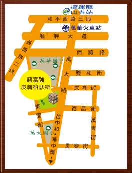龍山寺站下,二號出口出站前行至康定路右轉,搭乘往中和、東園方向公車(如601、246、260、673號等),公車約四站,於民和街口或德昌街口站下(德昌街口站牌旁)