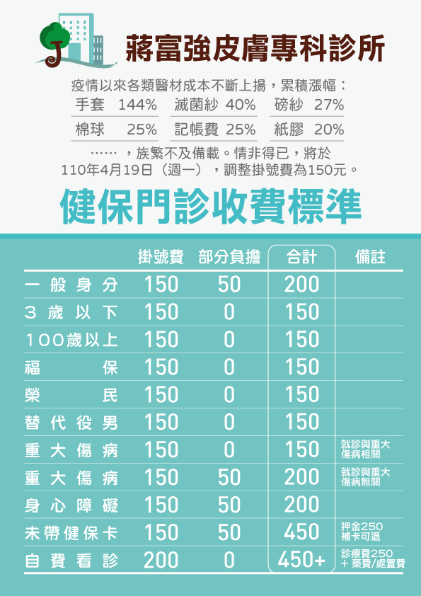 疫情以來醫材成本不斷上揚。情非得已,將於110年4月19日(週一),調整掛號費為150元。