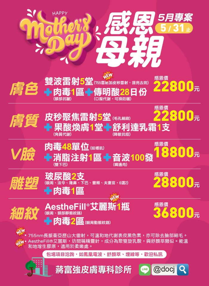 感恩母親、五月專案,雷射、玻尿酸、肉毒、艾麗斯等,皆享感恩價,5/31止。歡迎洽詢。詳情請見海報。