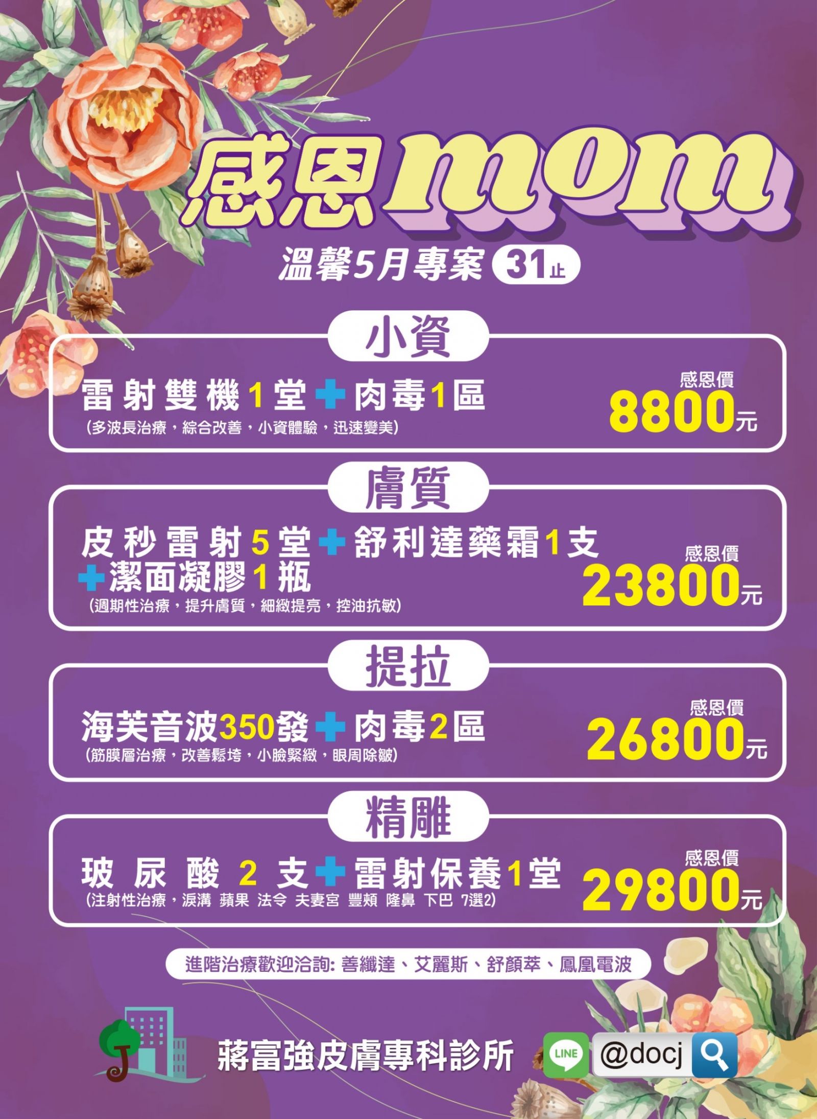 感恩母親,五月專案,5/31止 : 雷射、玻尿酸、音波享專案價,LINE ID搜尋 @docj。 [點入看海報]