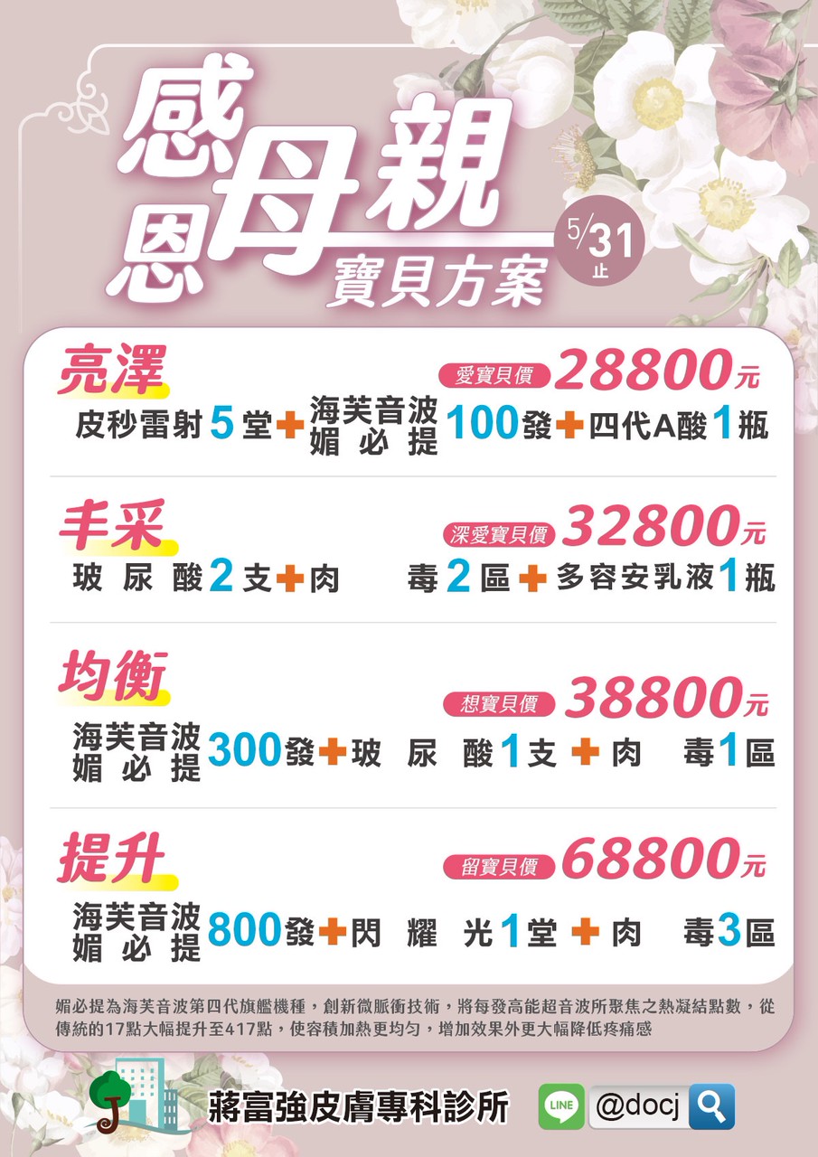 感恩母親,寶貝專案,5/31止。新進海四媚必提,緊緻拉提溶脂小臉,微脈衝技術大幅減痛、舒適度高。 皮秒、音波、肉毒、玻尿酸皆享專案價。~點入看海報~