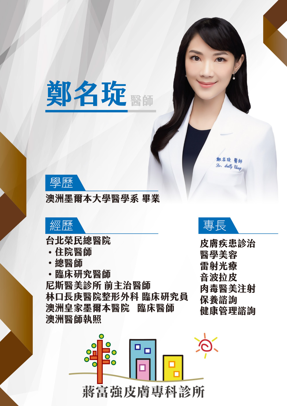 感謝台北榮總鄭名琁醫師,八月份起駐診指導。鄭醫師為留奧醫學士,返國於台北榮總取得專科醫師執照。專長為皮膚疾患與醫學美容。診次請見門診表。(點入看醫師介紹)