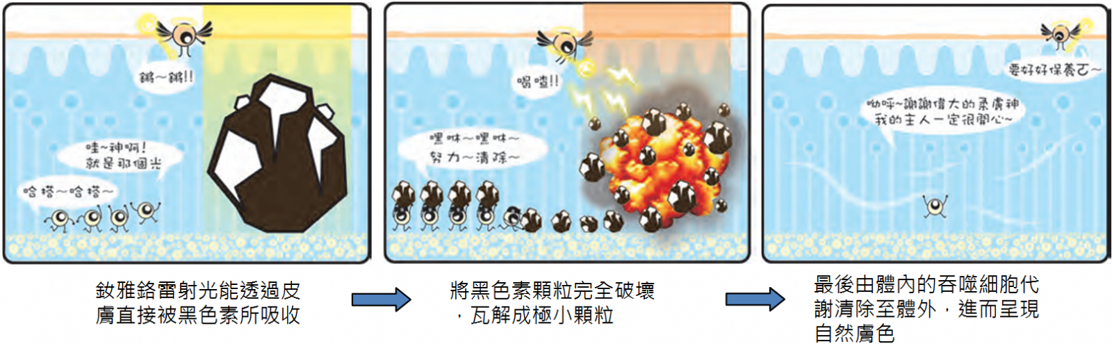 運用釹雅鉻雷射(Nd-Yag laser)光束,擊碎皮膚內的黑色素,再經由體外結痂脫落或體內吞噬細胞代謝,達到去除色斑的效果。