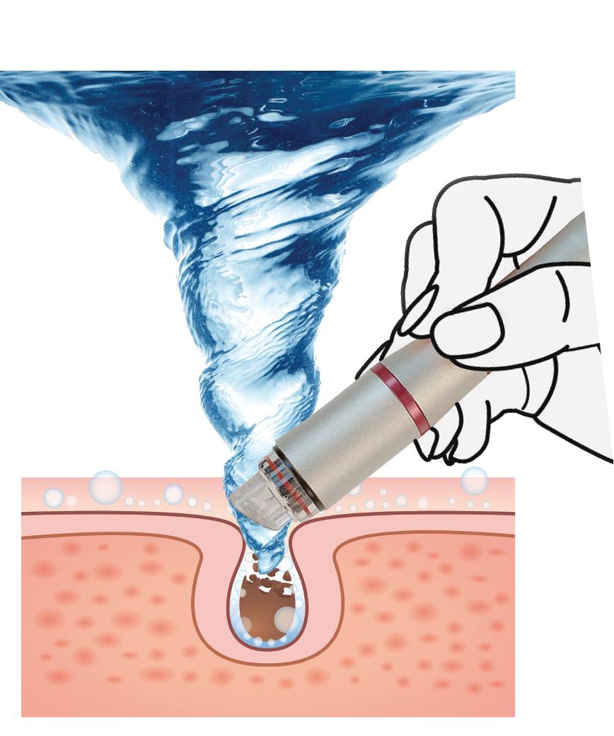 水飛梭為一附手把的機器,手把可以負壓吸住皮膚並產生迷你漩渦水柱沖洗毛孔,清潔毛孔中的油脂、角質與蟎蟲,污水再以負壓吸淨;水柱中尚加入了角質代謝精華(含檸檬酸、水楊酸、果酸),從而增加了去角質、控油、抗菌、美白等效果。