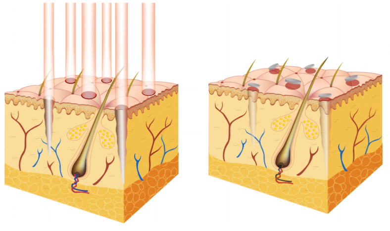 傳統磨皮技術為面性破壞,在亞洲人膚質常造成術後之傷口照顧困難、組織滲液,修復期長並常見反黑問題; 飛梭雷射乃將磨皮之雷射光束縮小、同時分散擊發多光束(如圖),使單發加總之施打面積下降為約20%的探頭面積,以保留大部分的正常皮膚組織,從而加速修復、降低疼痛。