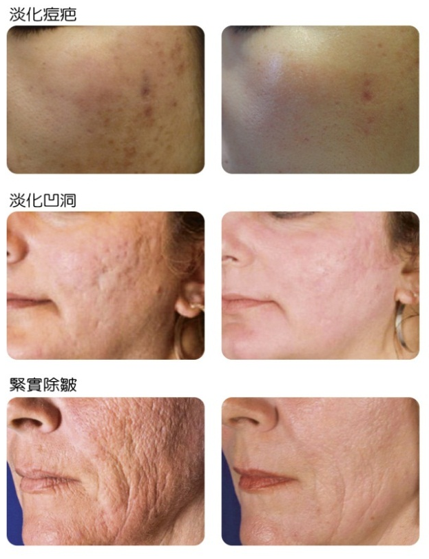 治療後立即有緊實與控油效果。三次治療後可見膠原增生與膚質改善。