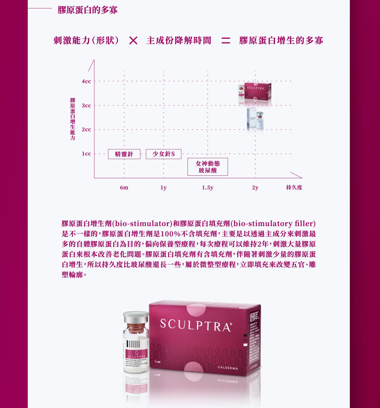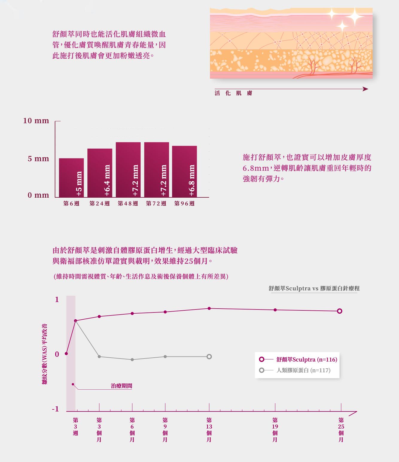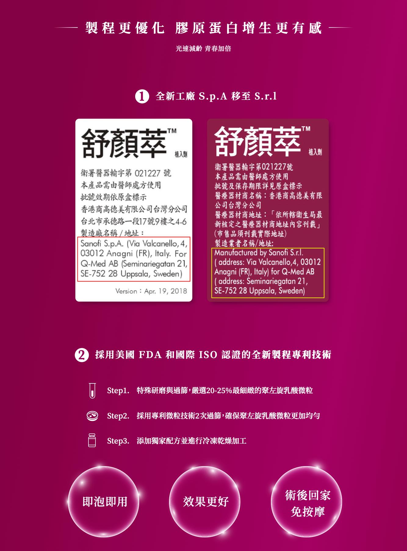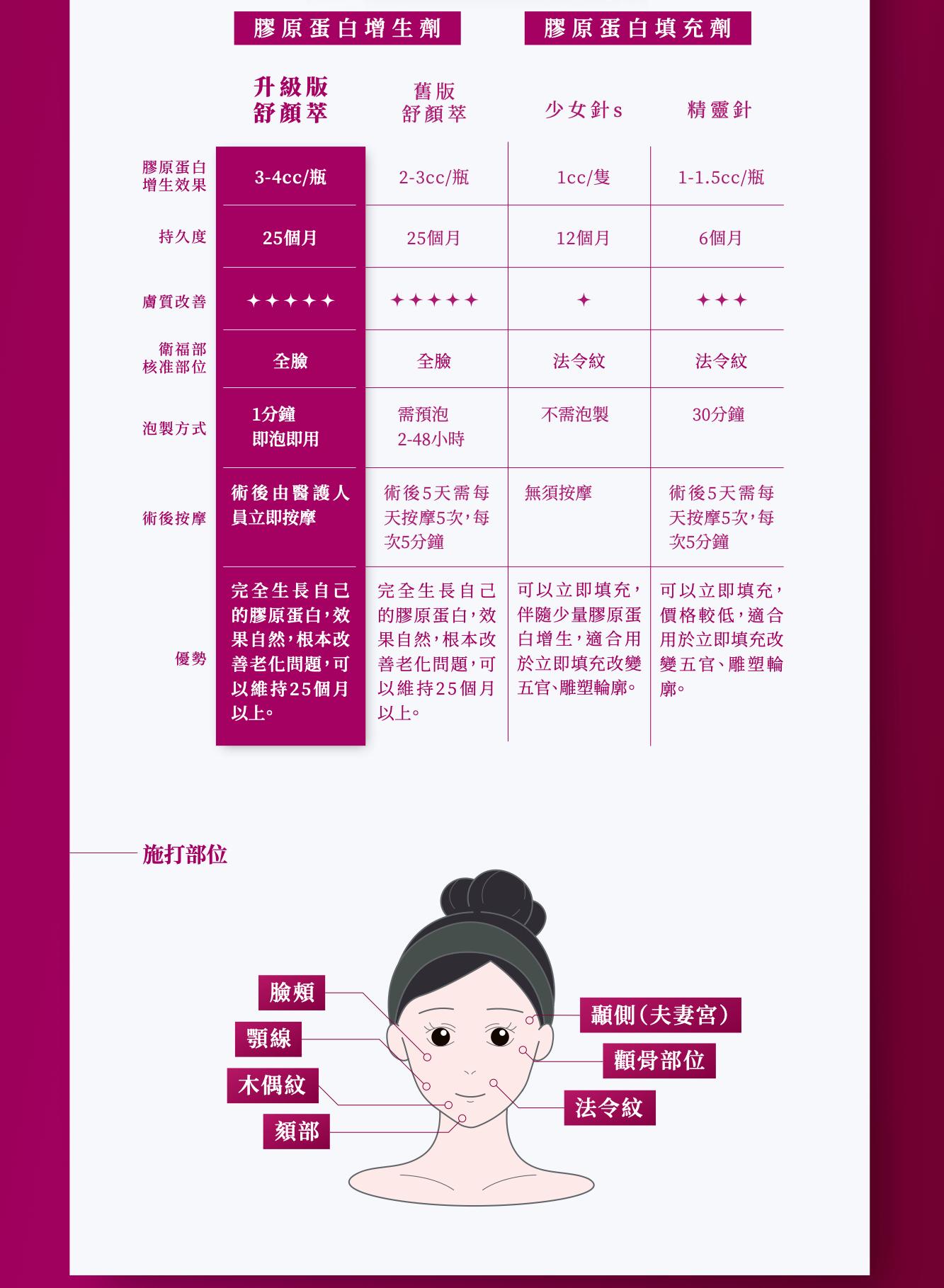 舒顏萃向為藝人所愛。成分為3D聚左旋乳酸的微粒,具有促生膠原的作用。2023年時改版升級為第二代,商品名為4D童妍針,將原初代舒顏萃的製程增加以特殊研磨、多次過篩等處理,嚴選出20~25%最細緻均勻的聚左旋乳酸微粒,使膠原促生效果比初代增加近一倍,同時大幅降低促生膠原不均產生之結節副作用,術後亦不需再按摩五天。