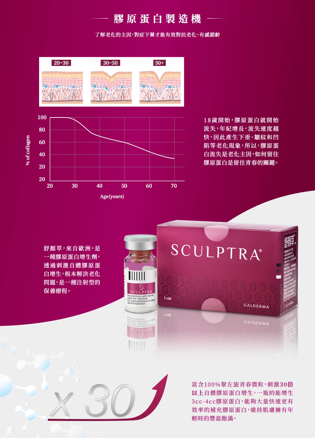 將藥品以適量無菌水泡製,混以麻藥,可以分裝出8支藥水。抽出後均勻施打於太陽穴(夫妻宮)、蘋果肌、臉頰、法令紋等處,藉由刺激膠原的作用,填補凹陷、增厚皮膚。從而改善輪廓、全臉拉提。此為一種非開刀式的液態拉皮技術。